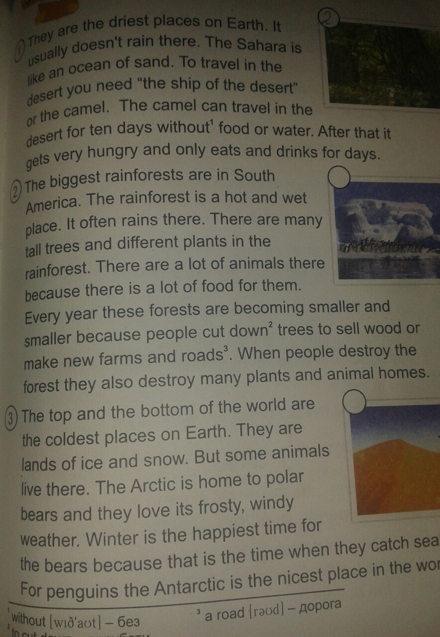 самые сухие места на Земле. Там нет дождя. Сахара союзник, как океан песка. Чтобы путешествовать, вам нужно «корабль пустыни» или верблюд. Верблюд может путешествовать в эфире в течение десяти дней без еды или воды. После этого он очень голоден и только ест и пьет в течение нескольких дней. Самые большие тропические леса находятся в Южной Америке. Тропический лес - это горячее и влажное место. Там часто идет дождь. В тропическом лесу много высоких деревьев и разных растений. Там много животных, потому что для них много еды. С каждым годом эти леса становятся все меньше и меньше, потому что люди вырубают деревья, чтобы продавать древесину или создавать новые фермы и дороги ». Когда люди уничтожают лес, они также уничтожают многие растения и дома животных. 3 и дно мира - самые холодные места на Земле. Это земли льда и снега. Но некоторые животные живут там. В Арктике живут белые медведи, и они любят свою морозную, ветреную погоду. Зима - самое счастливое время, когда они ловят морских медведей, потому что это время, когда в мире или пингвинах Антарктика - это место попоры. Без ?????