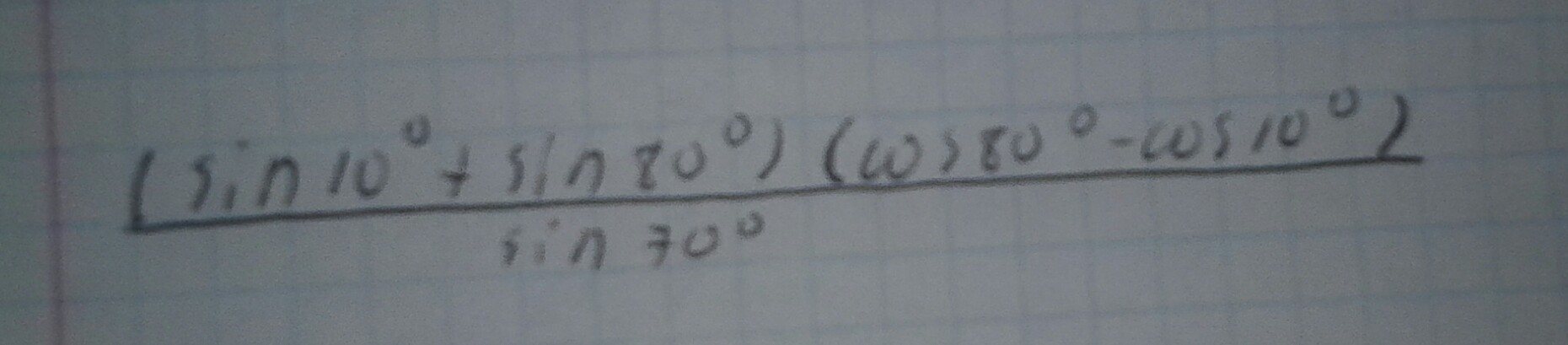 (sin 10° + sin 80°)(cos (90°-10°) - cos (90°-80°)) = (sin 10° + sin 80°)(sin 10° - sin 80°) = sin^2 10° - sin^2 80° = sin^2 10° - cos^2 10° = (1 - cos 20°)/2 - (1+ cos 20°)/2 = - 2cos 20°/2 = - cos 20° = cos (180° - 20°) = cos 160° = cos (90° +70°) = - sin 70°