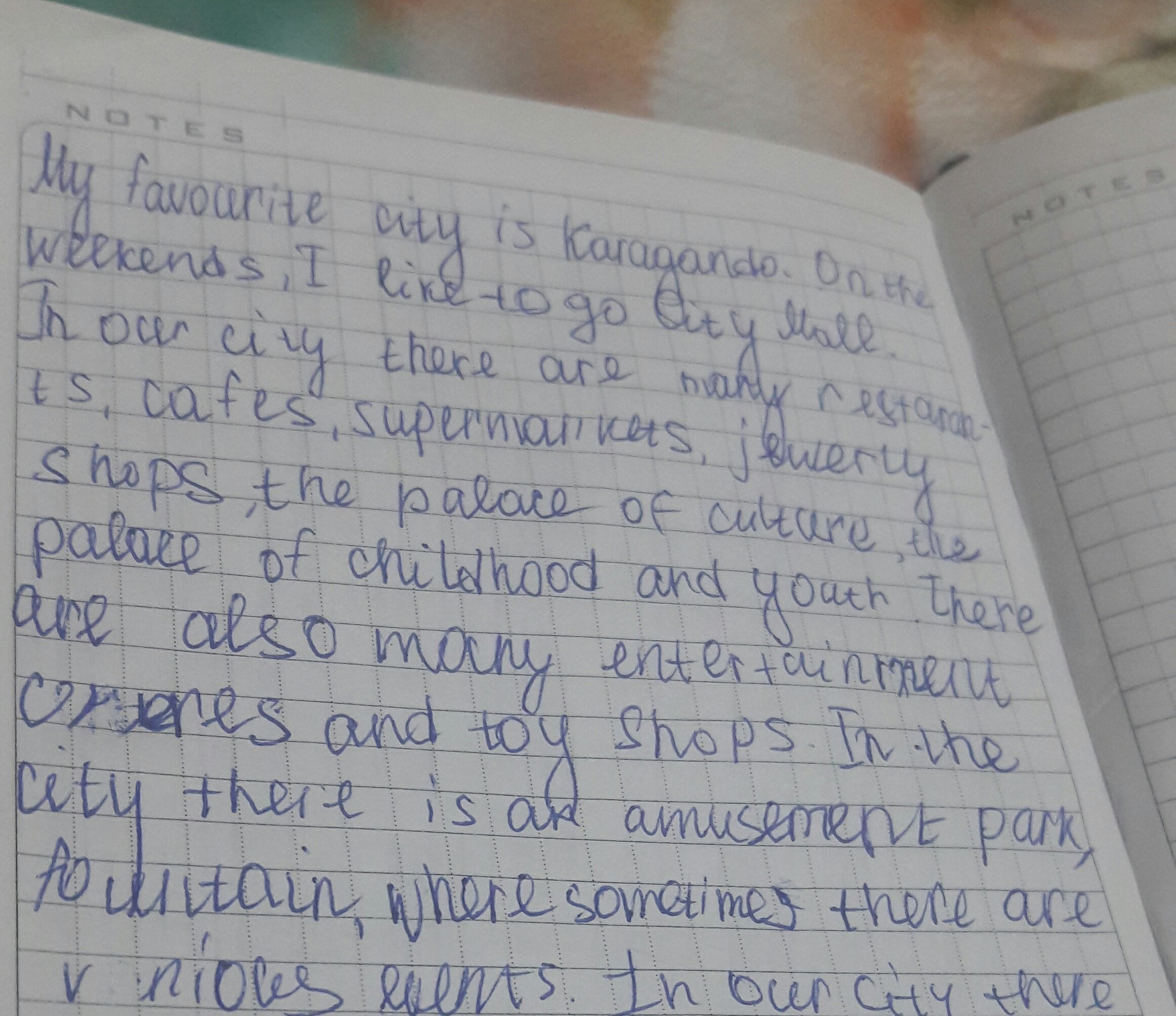 My favorite city is Karaganda. On weekends, I like to go to City Mall. In our city there are many restaurants, cafes, supermarkets, jewelry shops, the palace of culture, the palace of childhood and youth. There are also many entertainment centers and toy shops. In the city there is an amusement park, fountains, where sometimes there are various events. In our city there is an airport "Saryarka". In the summer I like to go to Topar, to fish there. In the southeast of Karaganda there is Stella "Tulpar", not far There is a boxing center Serik Sapiev, restaurant KFC, restaurant Piano. I really love my city and I want my foreign friends to also visit it