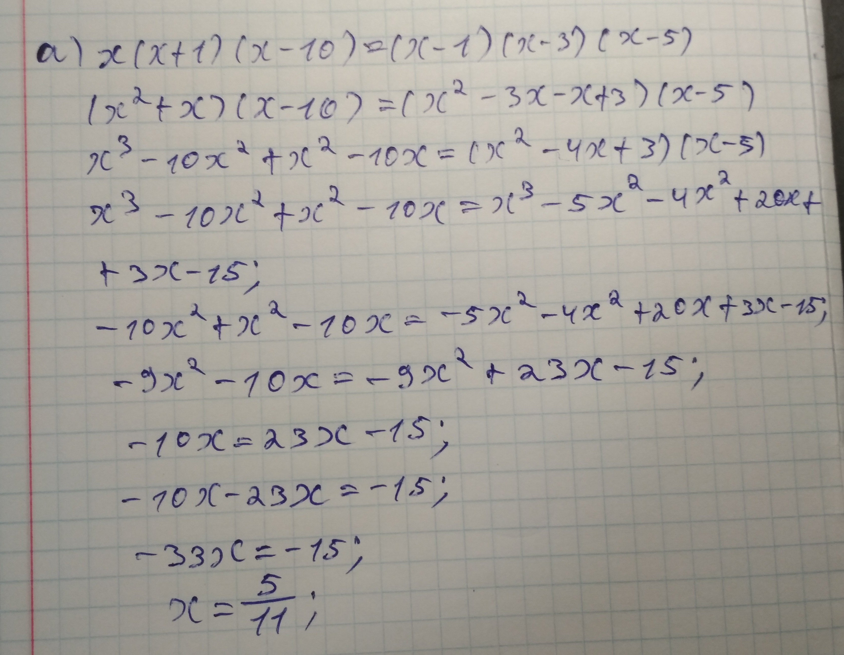 А) х(х+1)(х-10)=(х-1)(х-3)(х-5)