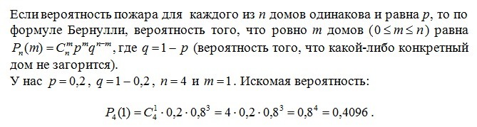 Страховая фирма застраховала от пожара 4 дома,вероятность того,что за страховой период случится пожар равна по 0,2 для каждого из домов.Найти вероятность того,что страховой фирме придется выплатить страховую сумму ровно одному из владельцев домов.