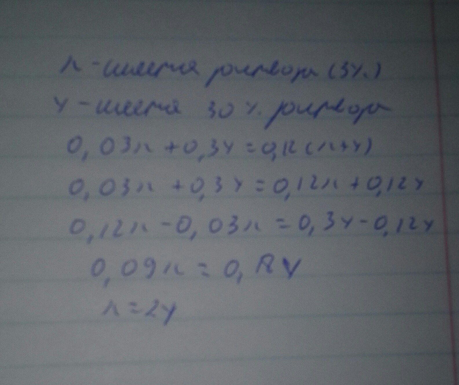 в каком отношении нужно смешать 3%-ый и 30%-ый растворы,чтобы получить 12%-ый раствор? Помогите пж