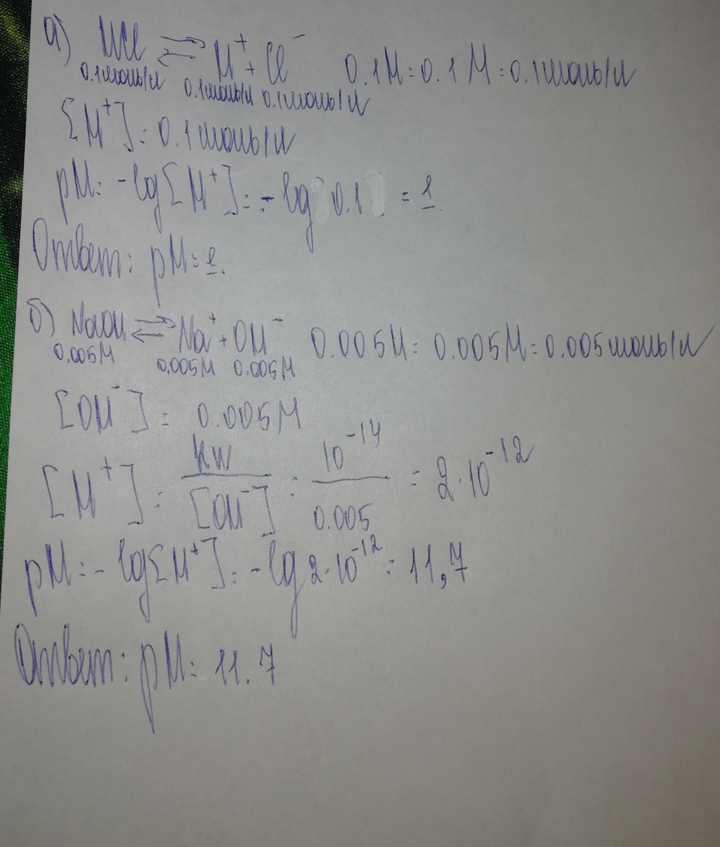 Вычислите концентрацию ионов H+ для: а) 0,1H раствора HCl; б) 0,005 раствора KOH