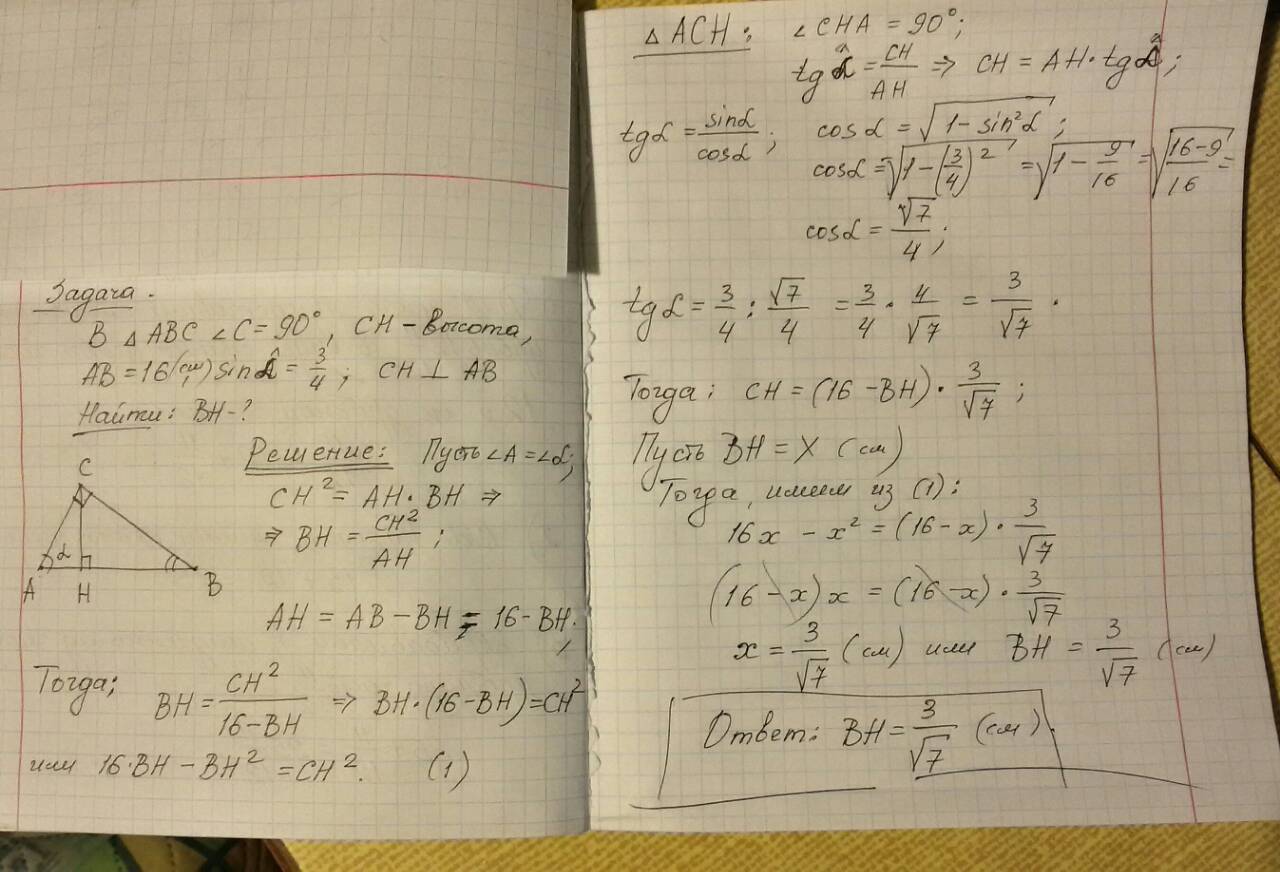 Смотрите решение на фото. Надо помнить, что высота прямоугольного треугольника, проведённая из вершины прямого угла, есть среднее пропорциональное между проекциями катетов на гипотенузу. И ещё, что сумма квадрата синуса угла и квадрата косинуса этого же угла равна единице (основное тригонометрическое тождество).
