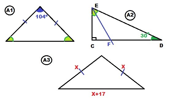 А1. Один из углов равнобедренного треугольника равен 104о. Найдите два других угла треугольника.