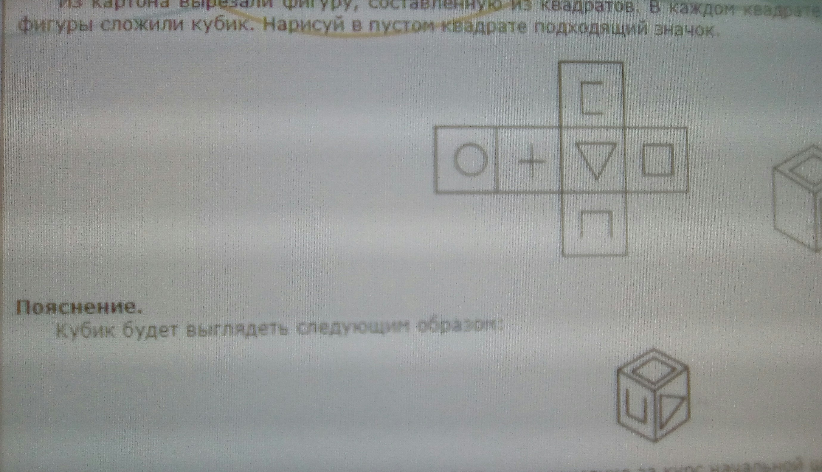 Из картона вырезали фигуру,составленную из квадратов. В каждом квадрате нарисовали какой-то значок. Затем из этой фигуры сложили кубик. Нарисуй в пустом квадрате подходящий значок.