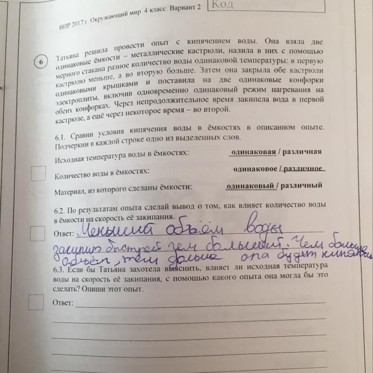 Опыт звучал бы скорее так: Таня решила приготовить четыре кастрю одинакового размера и налить в них одинаковое кол-во воды, настроив при этом, одну и туже температуру для каждой кастрюли. Так выяснилось что: (дописывай то, что сверху)