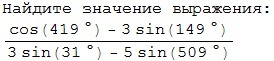 \frac{cos(59+360)-3sin(90+59)}{3sin(90-59)-5sin(149+360)}= \\ \\ \frac{cos(59)-3cos(59)}{3cos(59)-5sin(149)}= \frac{-2cos(59)}{3cos(59)-5sin(90+59)}= \frac{-2cos(59)}{3cos(59)-5cos(59)}= \\ \\ \frac{-2cos(59)}{-2cos(59)} =1