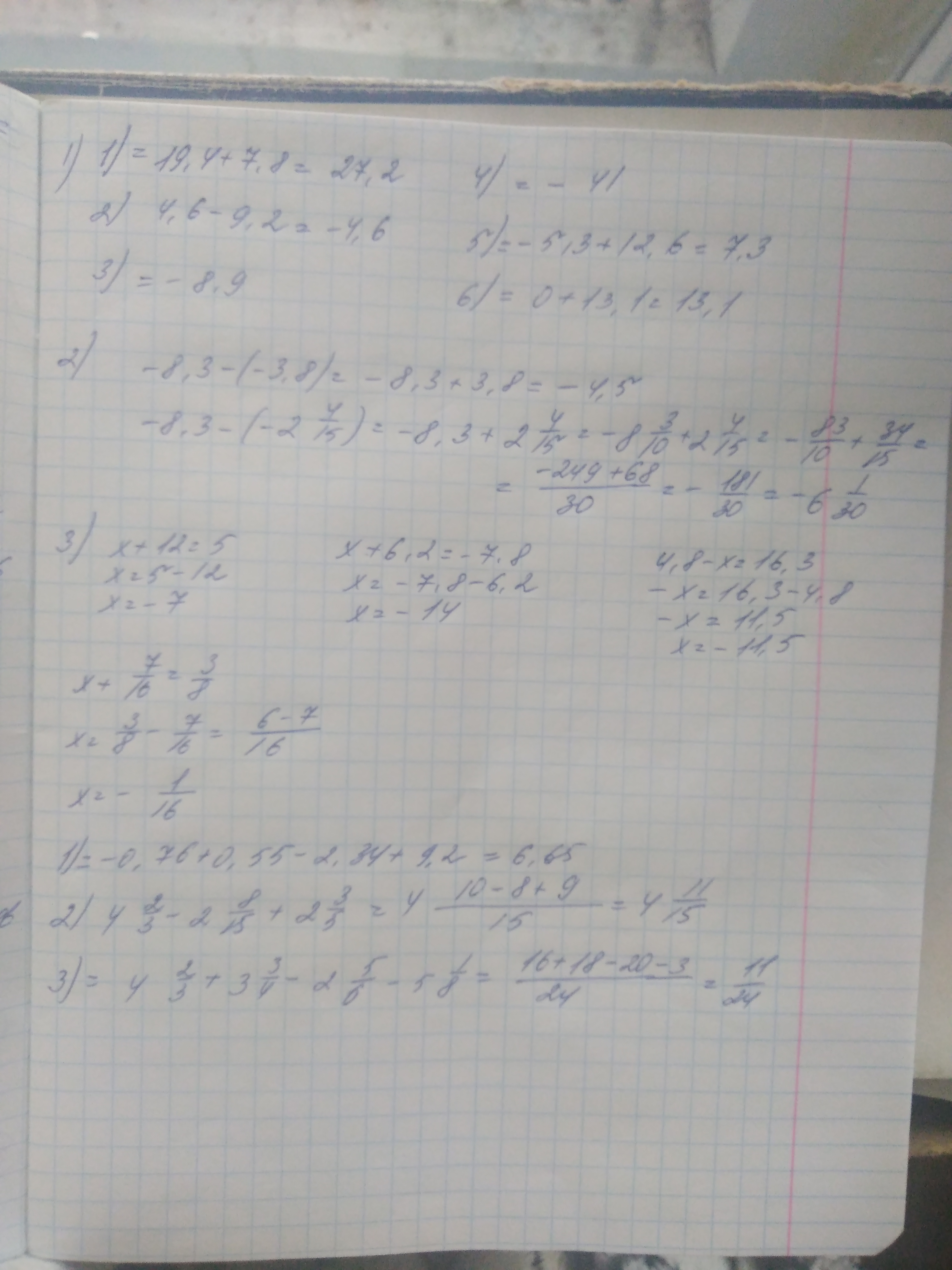 Выполнить вычитание: 1) 19,4 – (- 7,8); 2) 4,6 – 9,2; 3) 0 – 8,9; 4) – 24,8 – 16,2; 5) – 5,3 – (- 12,16); 6) 0 – (- 13,1). Найдите значение выражения – 8,3 – а, если: 1) а = - 3,8; 2) а = - 2 4/15. Решите уравнение: 1) х + 12 = 5; 2) х + 6,2 = - 7,8; 3) 4,8 – х = 16,3; х + 7/16 = 3/8. Найдите значение выражения: – 0,76 – (- 0,55) + (- 2,34) + 9,2; 4 2/3 + (- 2 8/15) – ( - 2 3/5); 4 2/3 – (- 3 3/4) + (- 2 5/6) – 5 1/8.