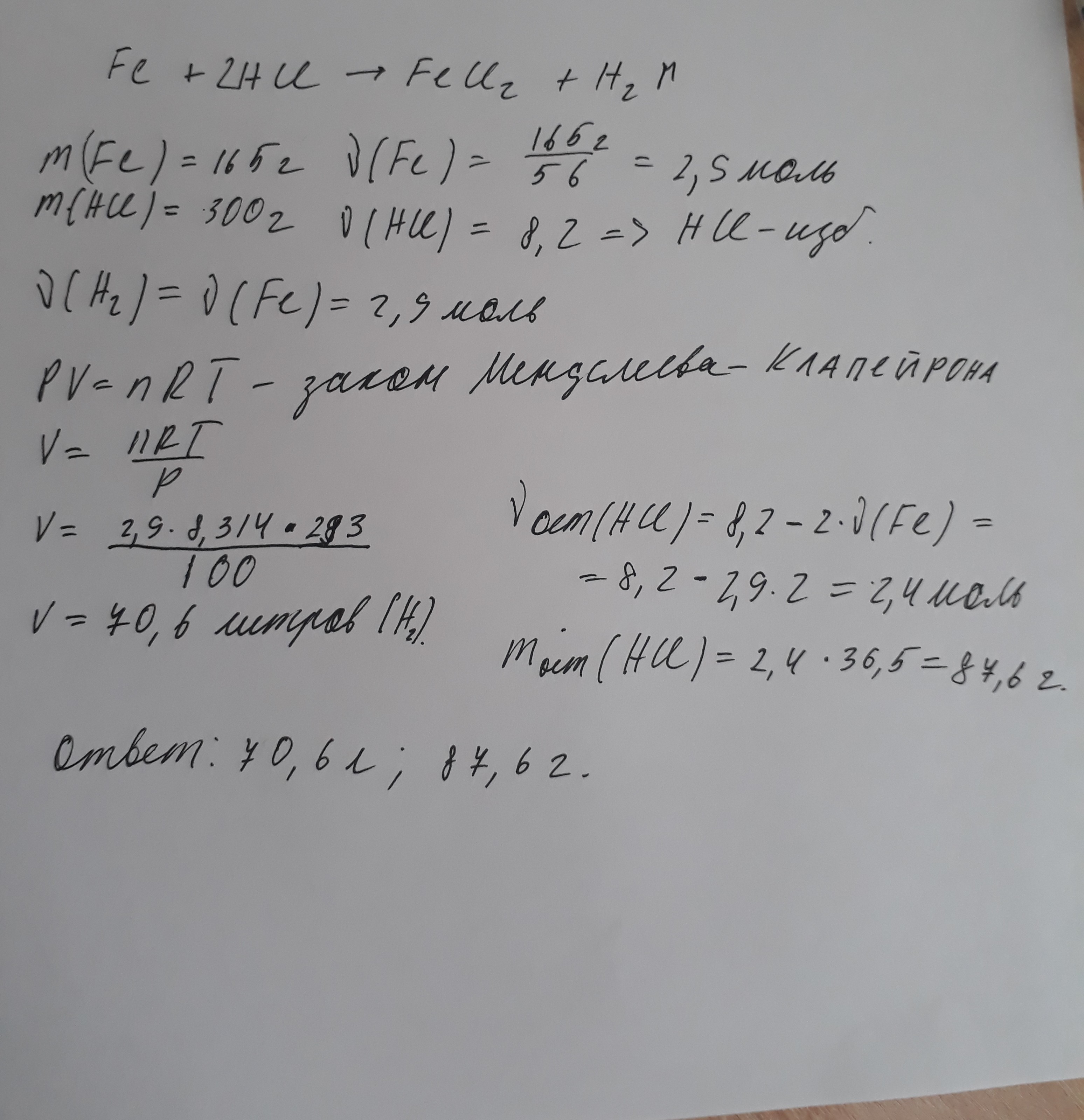 сколько литров водорода(20 градусов и 100 кПа) выделится при взаимодействий 165 г железа с 1 кг 30%-ного раствора HCL? Сколько граммов HCl не войдет при этом в реакцию? помогите пожалуйста