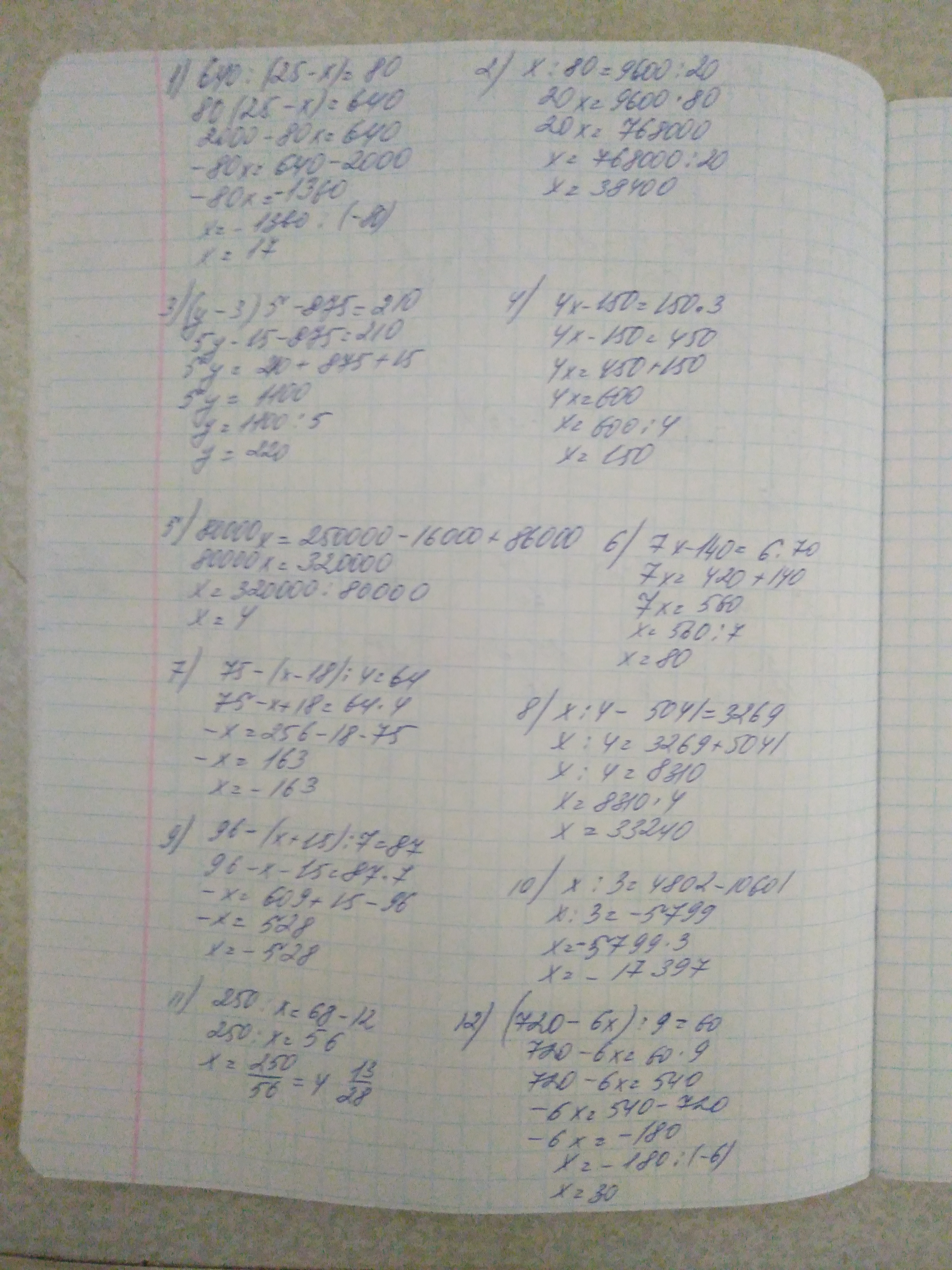 640:(25-х)=80,х:80=9600:20,(у-3)*5-875=210,(4*х-150):3=150,80000*х-86000=250000-16000,(7*х-140):70=6,75-(х-18):4=64,х:4-5041=3269,96-(х+15):7=87,10601-х:3=4802,(250:х+12)=68,(720-х*6):9=60 решите пожалуйста дам 17 баллов срочно