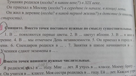 В полянке появились новые цветы. В дереве цветут яблони. В доме я жил деревне. В парке мы отмечаем День независимости. Он приехал в город в Днепро сени. Спендиров родился в Каховке. Занятия в школе начинаются в 1 сентября. Ученики сдают экзамены в классе.