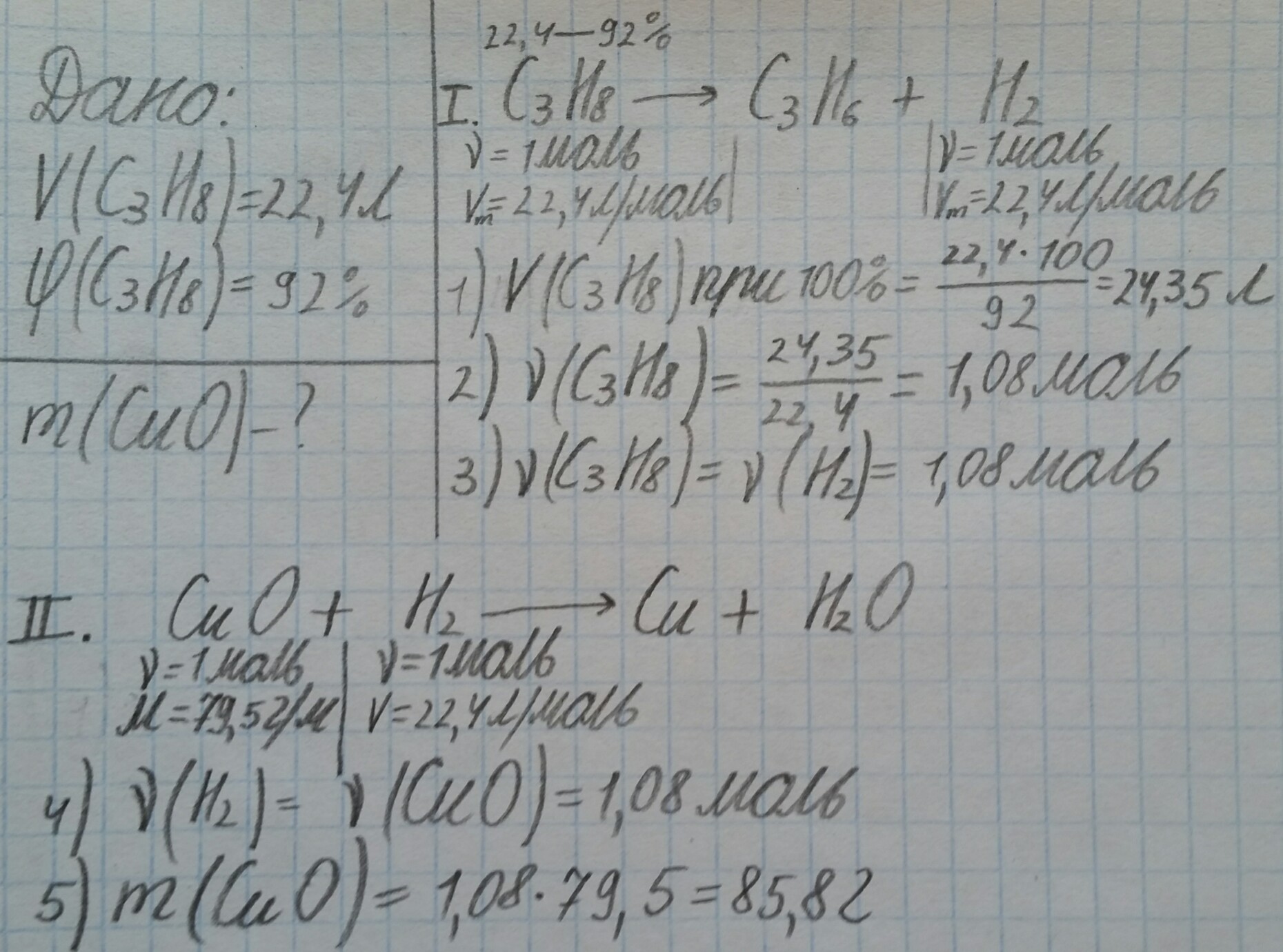 При дегидрировании 22,4 л пропана до пропена с выходом 92% получили водород, которого хватит для восстановления оксида меди(2) массой __ грамм.