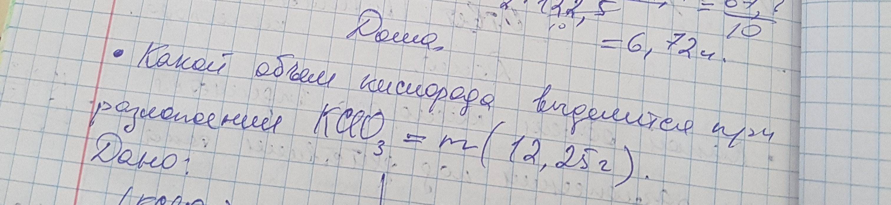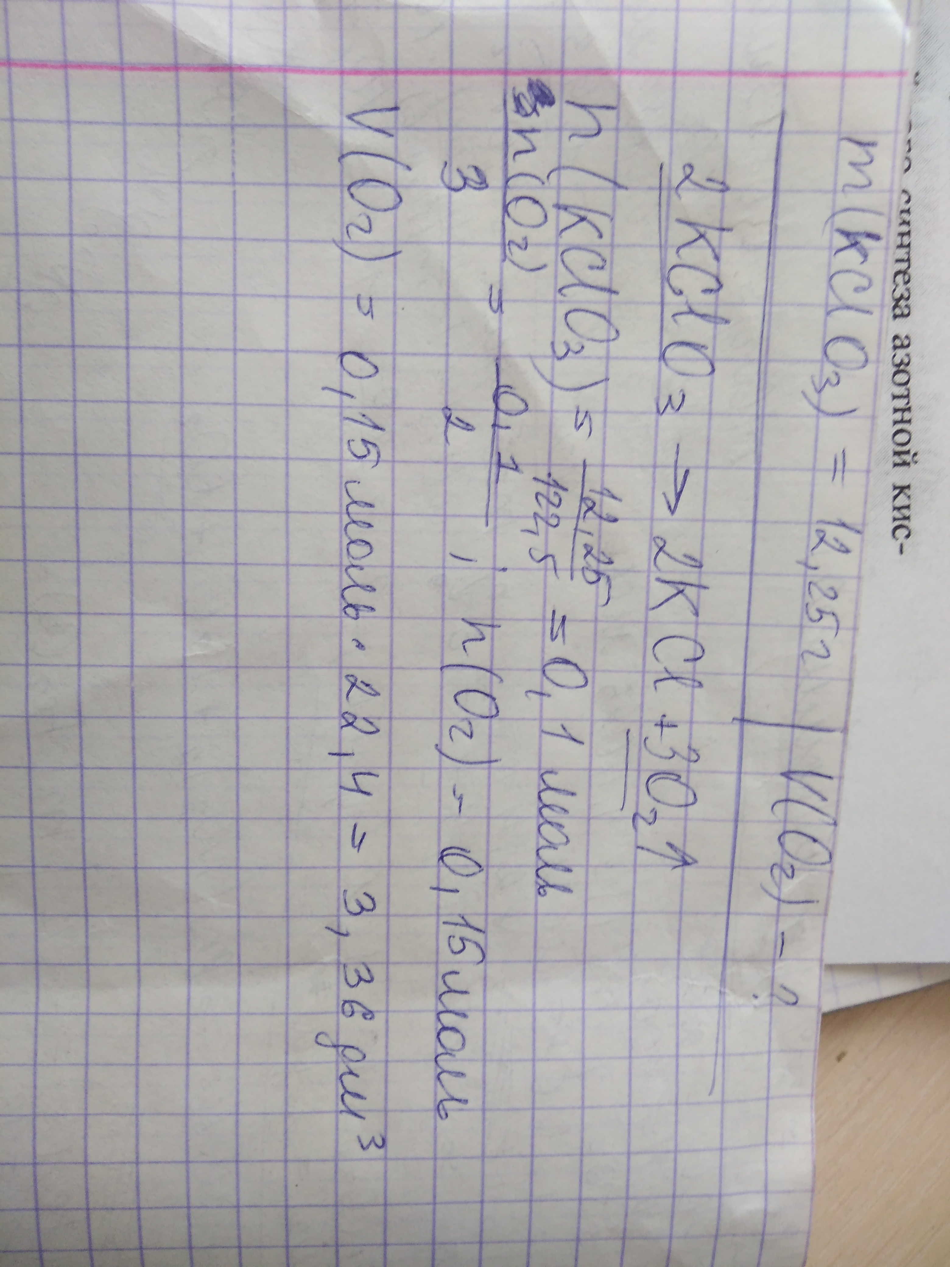 0,1 моль х моль2KClO3 = 2KCl + 3O22 моль 3 мольn = m/MM(KClO3) = 39 + 35,5 + 48 = 122,5 г/мольn(KClO3) = 12,25 г / 122,5 г/моль = 0,1 моль0,1 = х 2 3х = 0,15n(O2) = 0,15 г/мольm = n*MM(O2) = 32 г/мольm(O2) = 0,15 моль * 32 г/моль = 4,8 гОтвет: 4,8 г