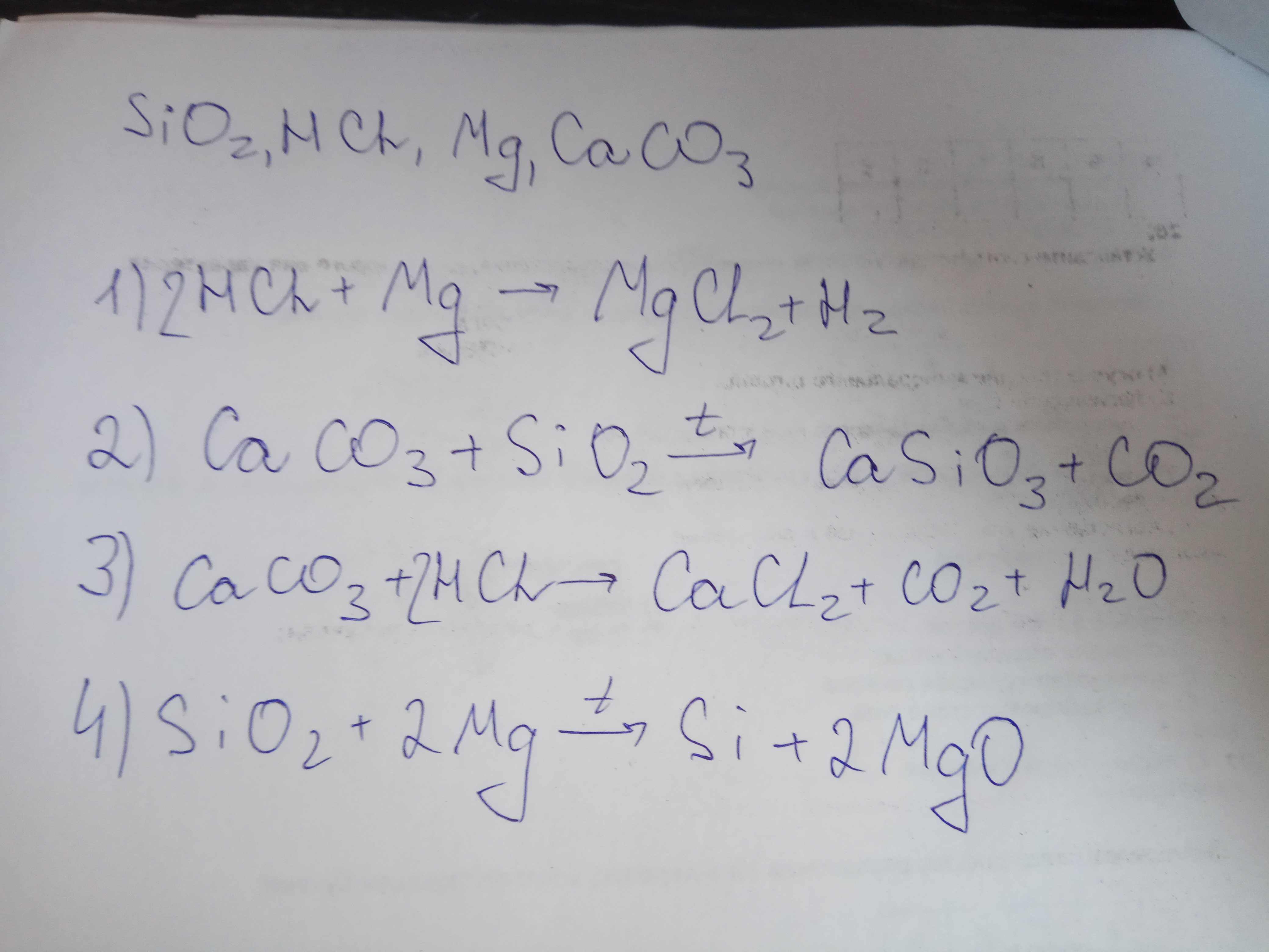 Даны: оксид кремния, соляная кислота, магний, карбонат натрия. Напишите уравнения четырех возможных химических реакций между этими веществами!!!