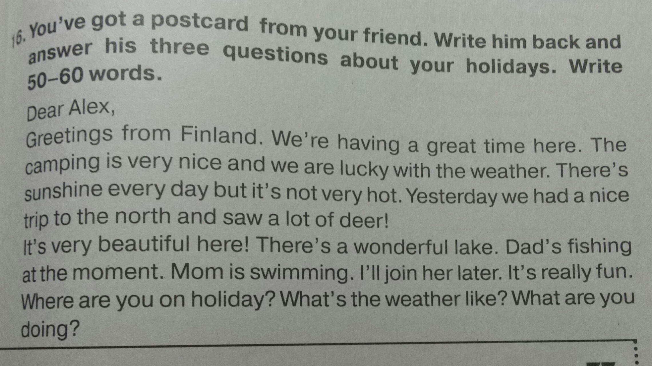 Здесь персонально, тут надо написать ответ твоему другу о твоих каникулах. Напиши мне по русски, я напишу по английски.