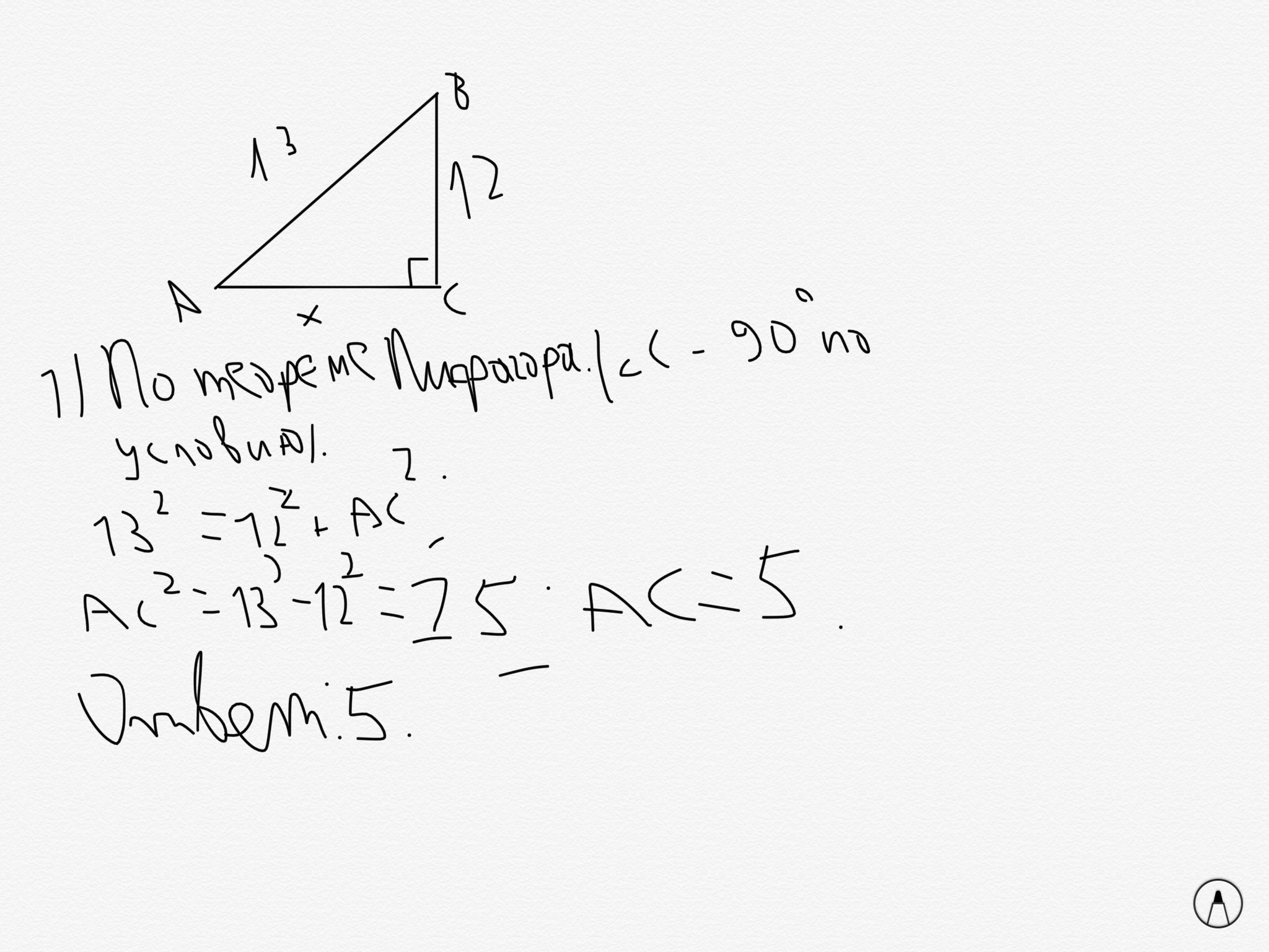 в треугольнике ABC угол С равен 90 градусов AB равен 13 ВС равен 12 найти АС по теореме Пифагора
