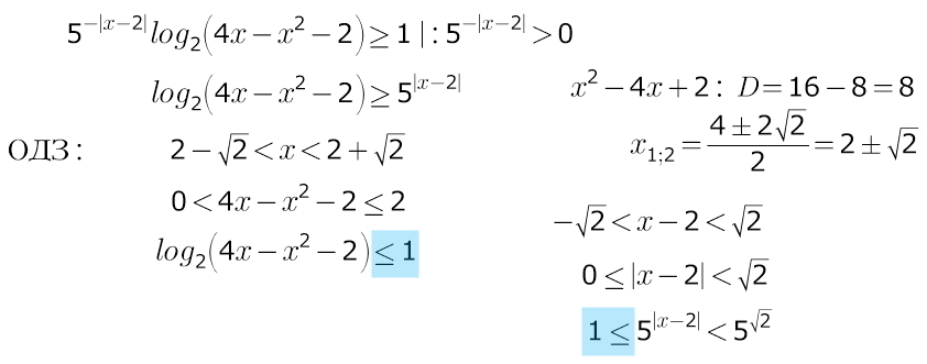 а 5 в степени |x-2| наоборот, убывает для х∈(2-√2; 2)...