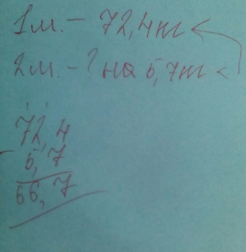 помогите мне пожайлуста решить задачу в первом мешке было 72.4кг картофеля а вдругомна 5.7кг меньше сколько кг сколько кг картофеля было во втором мешке