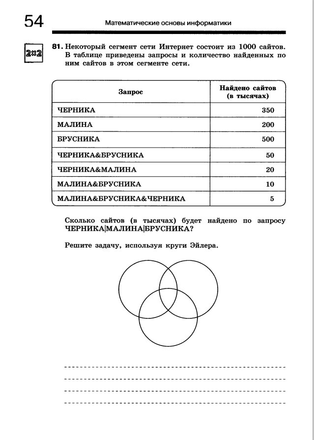 Например: Если набрать запрос Черника то выдаст 350тыс. , а если добавить Черника & Брусника(& - знак означает "И", тоесть он ищет сайты где будет черника и брусника ) выдаст 50тыс. (Знак | означает или,тоесть или черника или малина или брусника в результате чего результатов поиска будет больше)Считаем черника(350) + Малина(200) + Брусника (500) = 1050тыс . В случае с кругами надо закрашивать всё