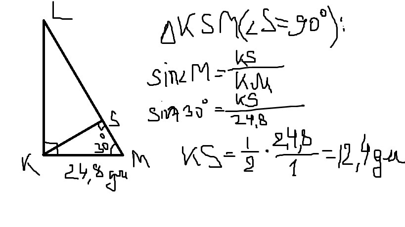 Или проще: ΔКSМ(∠s=90°): Катет лежащий напротив угла 30° равен половине гипотенузы. Тогда КS= 12,4 дм