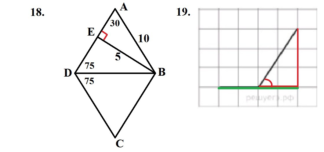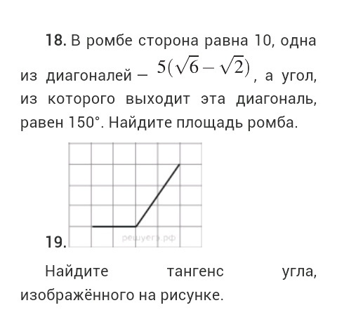 18. В ромбе сторона равна 10, одна из диагоналей - 5(6^(1/2)-2^(1/2)), а угол, из которого выходит эта диагональ, равен 150 градусам. Найдите площадь ромба.