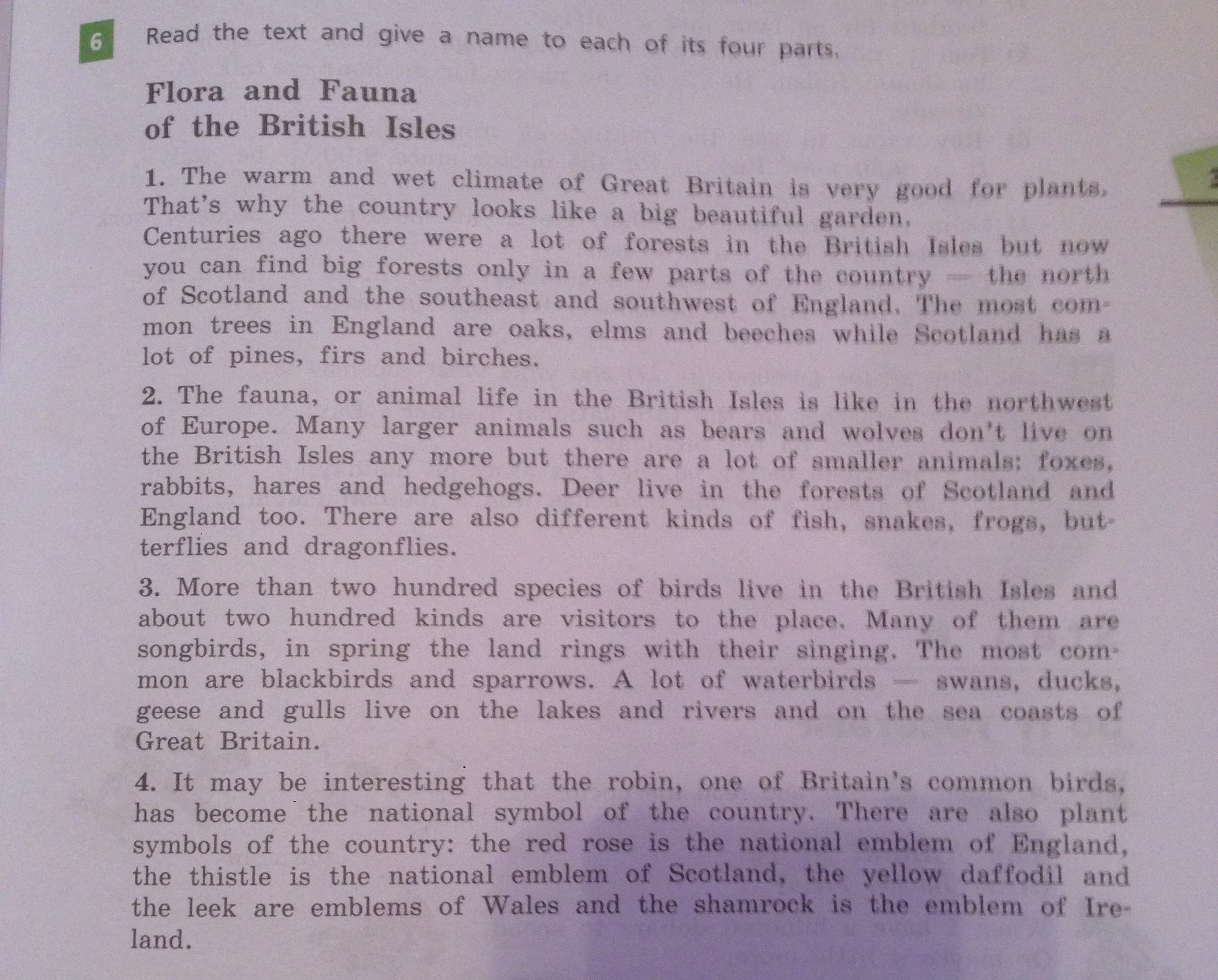2) фауны или жизнь животных на Британских островах, как на северо-западе Европы. Многие крупные животные, такие как медведи и волки не живут на Британских островах больше, но есть множество мелких животных: лисы, кролики, зайцы и ежи. Олени тоже живут в лесах Шотландии и Англии. Существуют также различные виды рыб, змей, ящериц, лягушек, бабочек и стрекоз.
