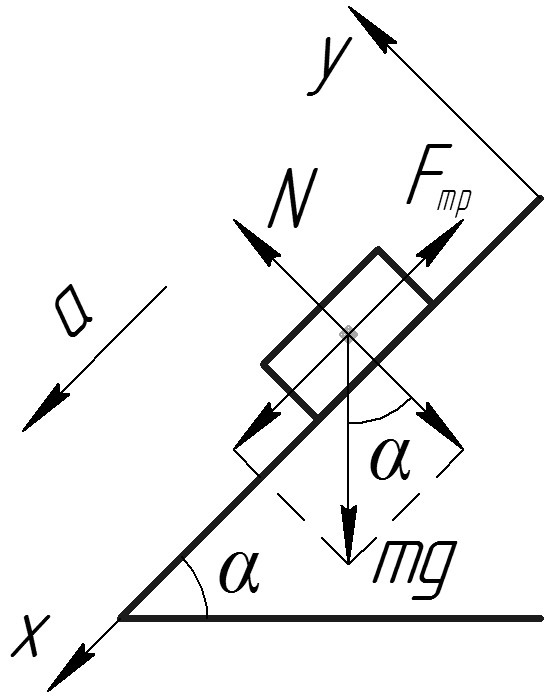 1. Тело массой 500 г. скользит по наклонной плоскости с углом наклона 30 град.Коэффициент трения равен 0,1. Определить ускорение тела.