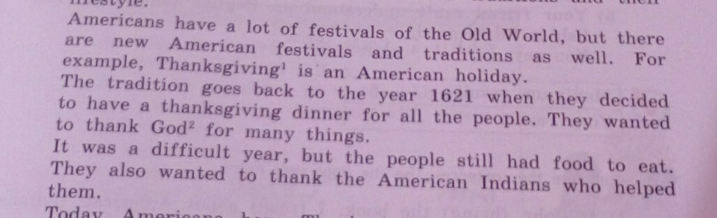 У американцев много фестивалей Старого Света, но есть и новые американские фестивали и традиции. Например, День Благодарения! это американский праздник. Традиция восходит к 1621 году, когда они решили провести благодарственный ужин для всех людей. Они хотели поблагодарить Бога? за многое. Это был трудный год, но у людей все еще была еда, чтобы поесть, они также хотели поблагодарить американских индейцев, которые помогли им.