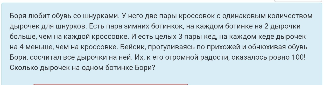 На одном ботинке Бори 12 дырочек.