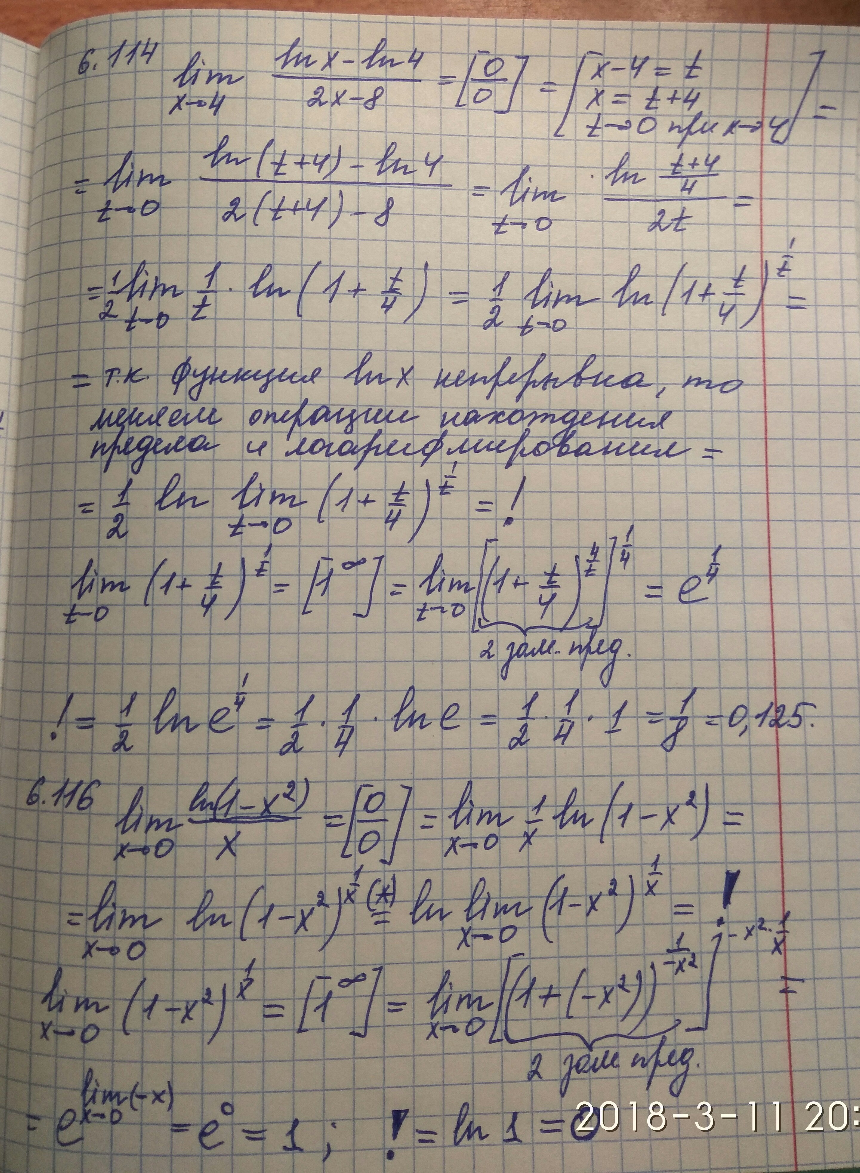 Знак * во втором пределе означает пояснение перемены мест нахождения предела и операции логарифмирования (см первый пример).