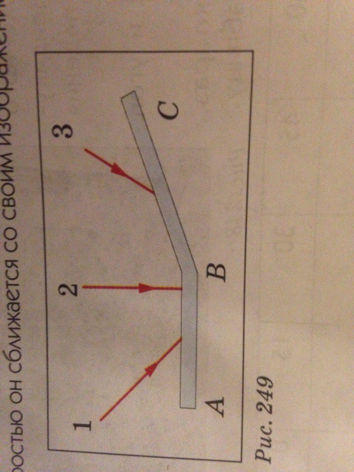 На рисунке 249 показаны световые лучи 1, 2, 3, падающие на зеркало ABC. Сделайте чертеж в тетради и укажите дальнейший ход световых лучей. Построение обосновать. Укажите, сколько градусов составляют углы падения и отражения для данных световых лучей.