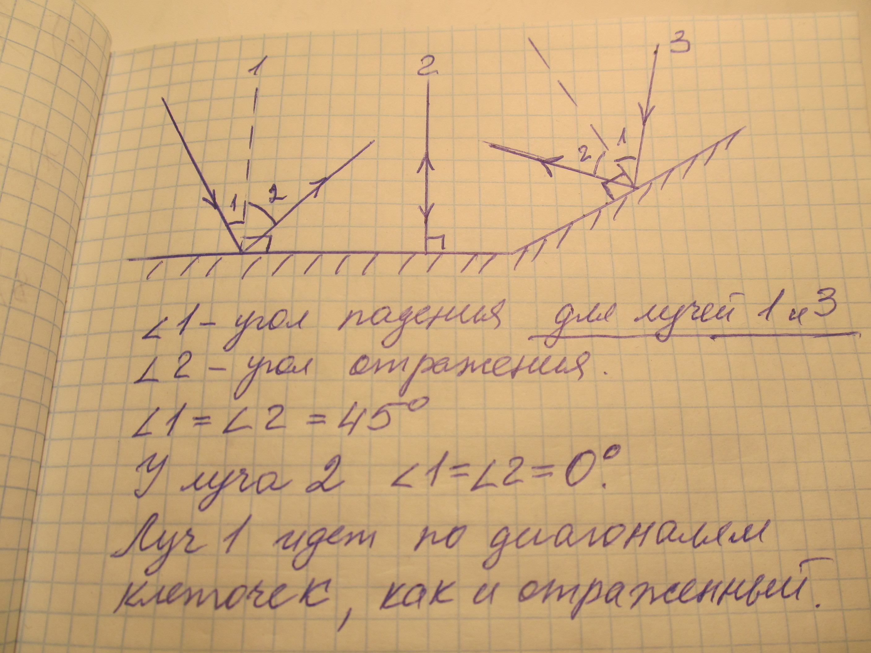 На рисунке 1-ый падающий луч идет неточно, он должен идти по диагоналям клеточек, как и отраженный, чтобы углы 1 и 2 были по 45 гр.
