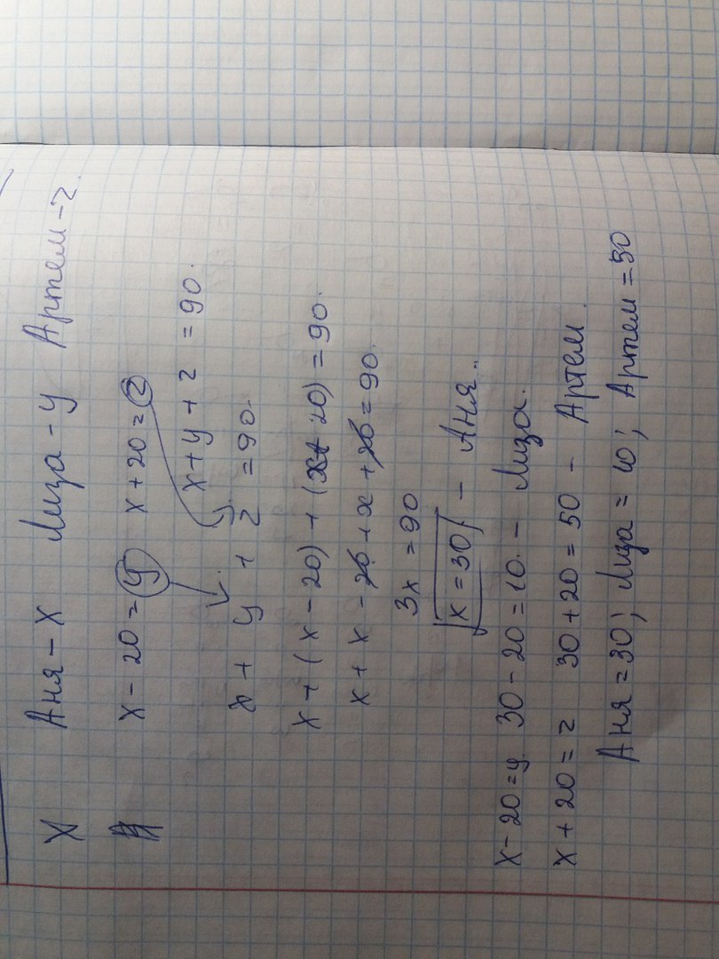 Смотри. Аня=x Лиза = y Артем=z. x-20=y x+20=z x+y+z=90