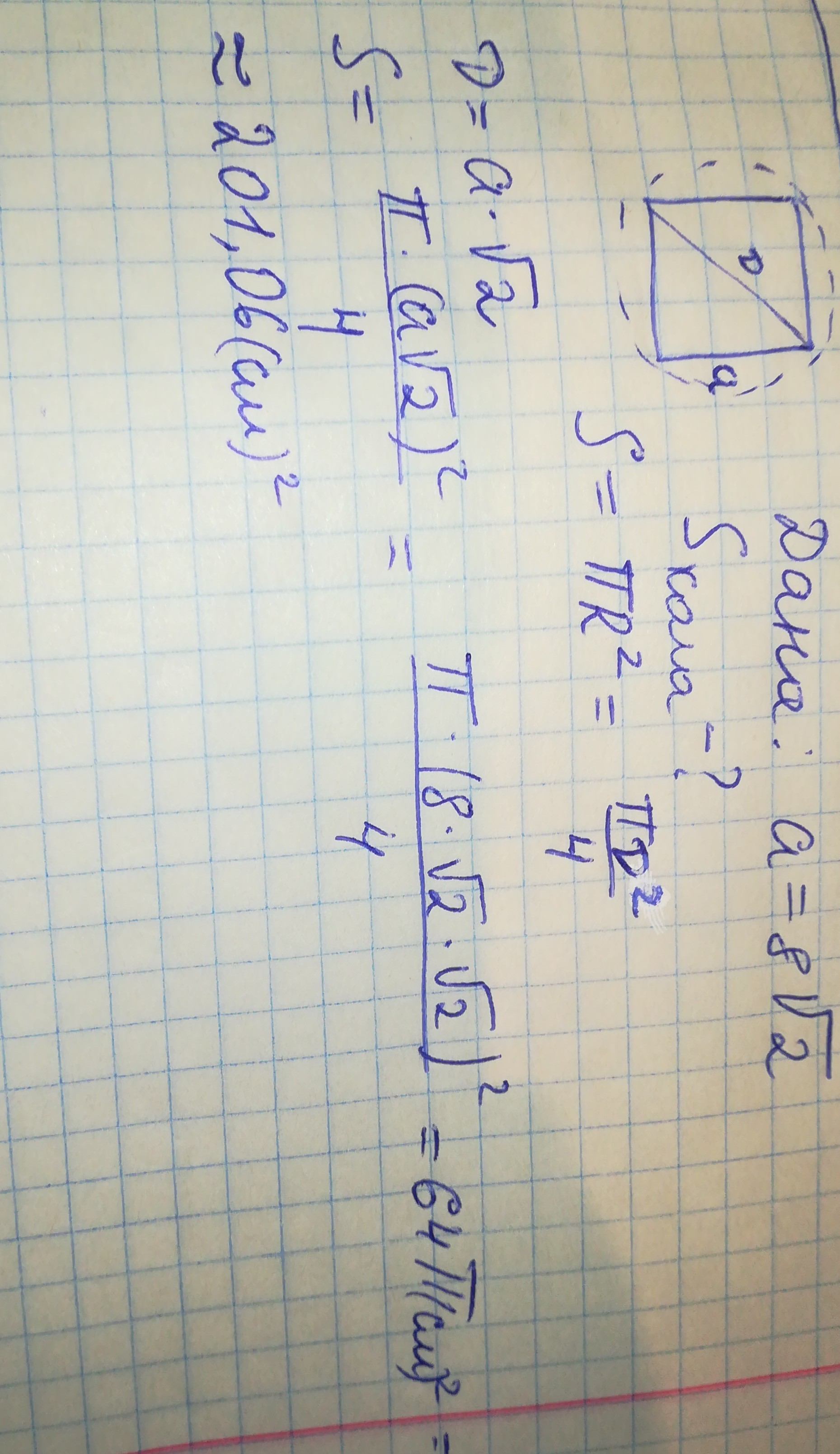 Сторона квадрата равна 8√2 см.Вычислите площадь круга,ограниченного окружностью, описанной около квадрата.