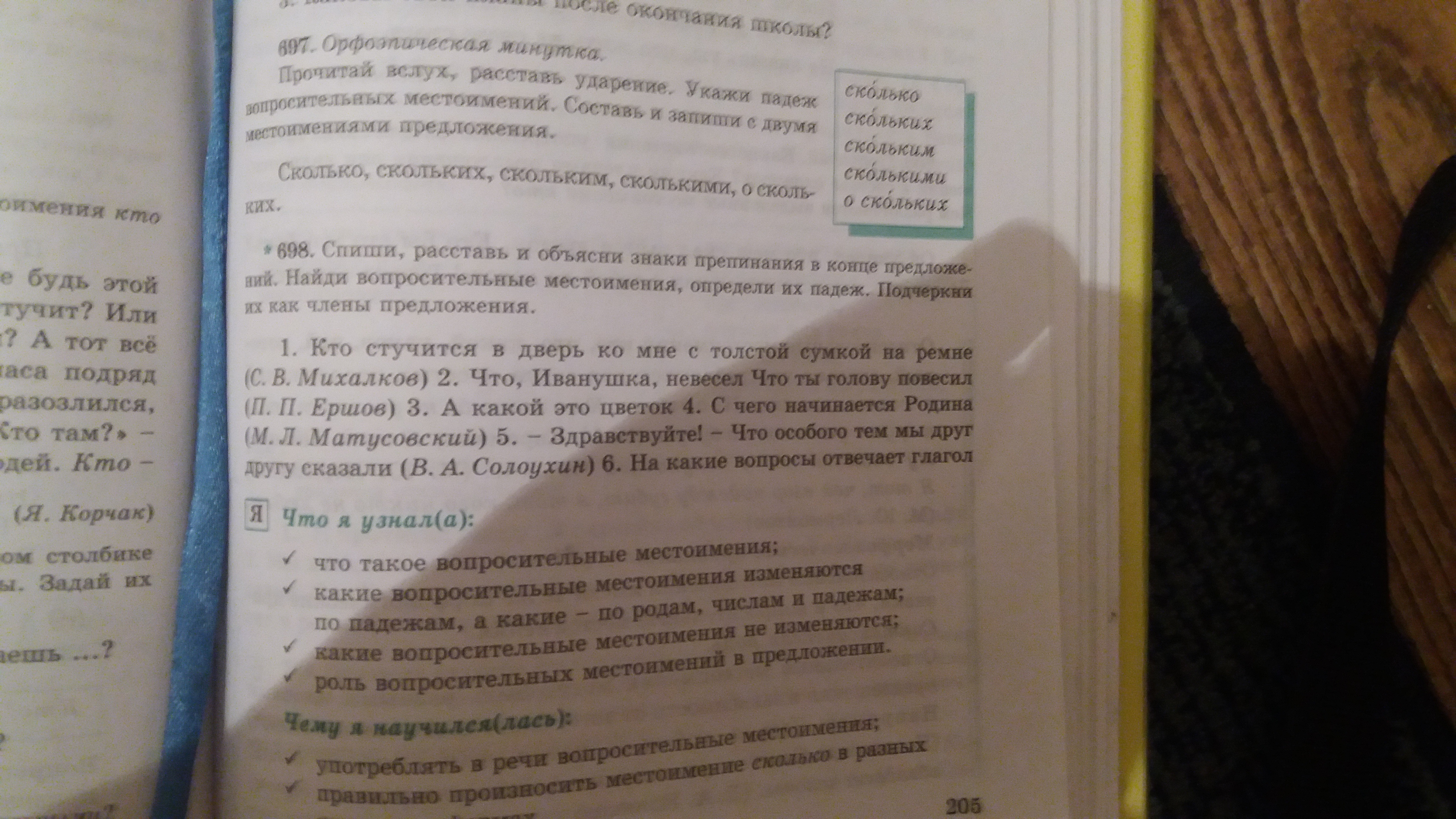 В конце каждого предложения ставится вопросительный знак.Местоимения кто,что.