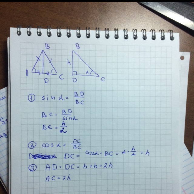НУЖНА ПОМОЩЬ!!!!срочно!!!!В равнобедренном треугольнике АВС с основанием АС проведена высота ВD. Найдите боковые стороны и основание, если угол A равен альфа BD=h