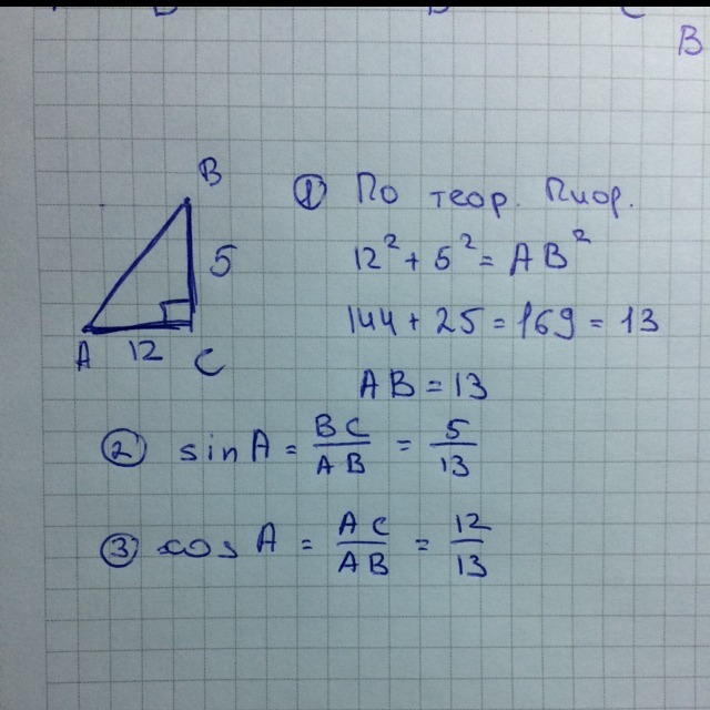 В треугольнике ABC угол C - прямой, AC = 12 см, BC = 5 см. Найдите AB, sin A, cos A.