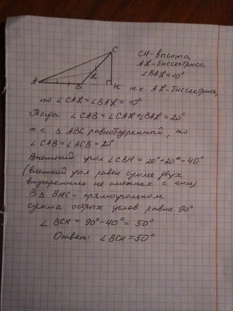 В тупоугольном равнобедренном треугольнике ABC, AB=BC. Проведены высота CH и биссектриса AL. Известно, что угол BAL=10 градусам. Найдите величину угла BCH в градусах.