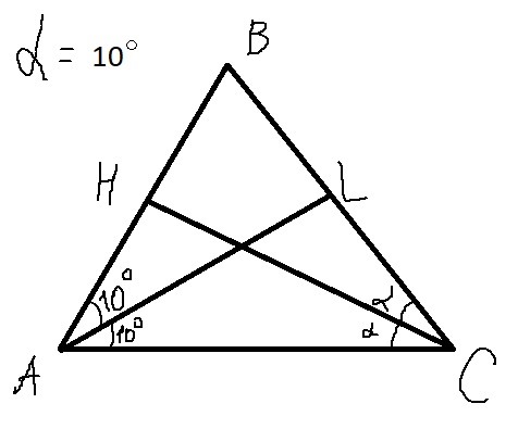 в равнобедренном треугольнике медиана является биссектрисой и высотой. То есть AL и CH две одинаковые линии.