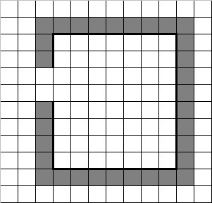 Напишите для Робота алгоритм, закрашивающий все клетки, расположенные вдоль стен прямоугольника с внешней стороны и угловые клетки Проход должен остаться незакрашенным. Робот должен закрасить только клетки, удовлетворяющие данному условию. Например, для приведённого выше рисунка Робот должен закрасить следующие клетки (см. рисунок).