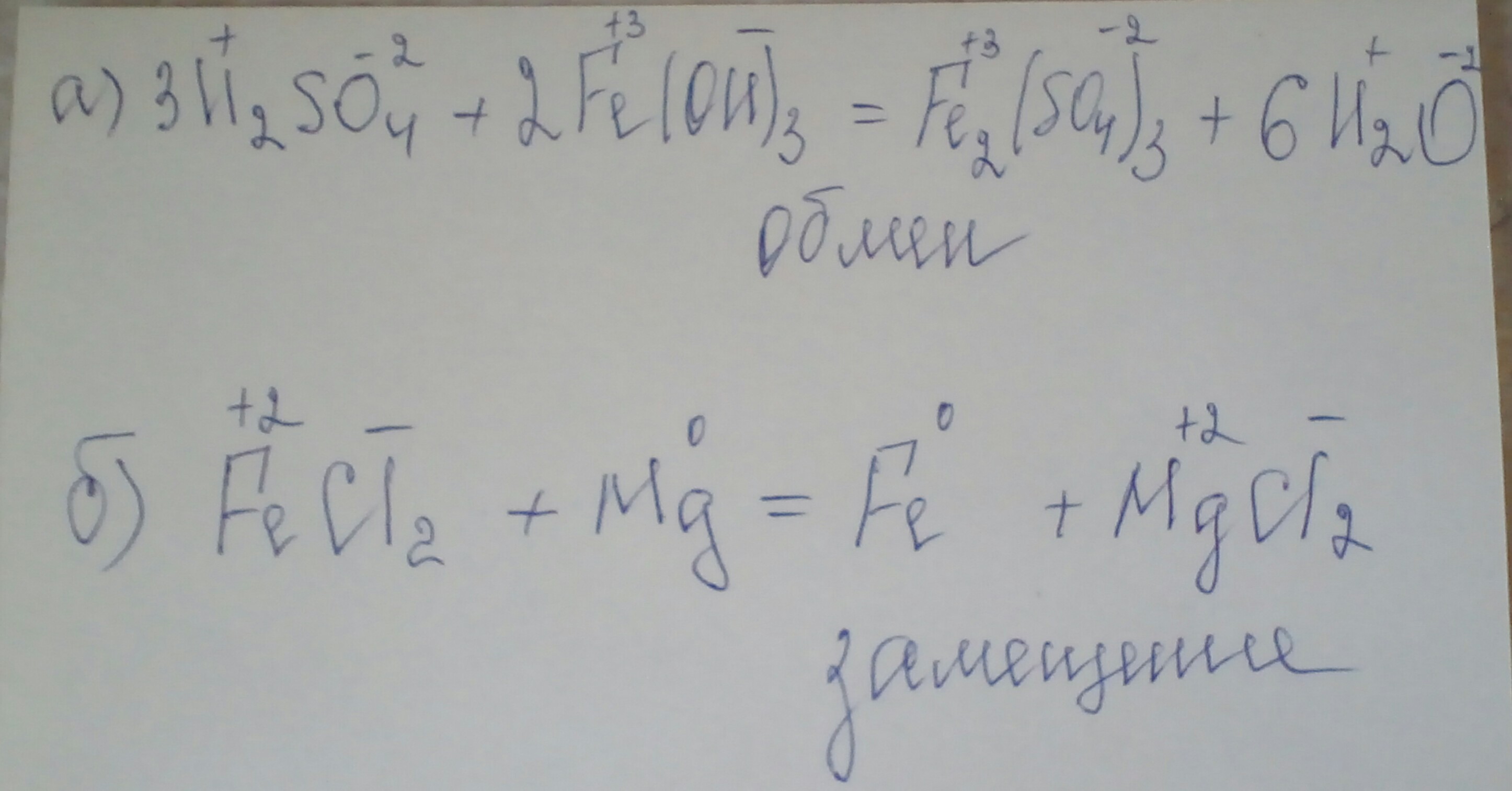 Составить хим уравнение и записать тип хим реакции : а) серная к-та + гирдооксид Fe(III) б) хлорид Fe(II) + Mg