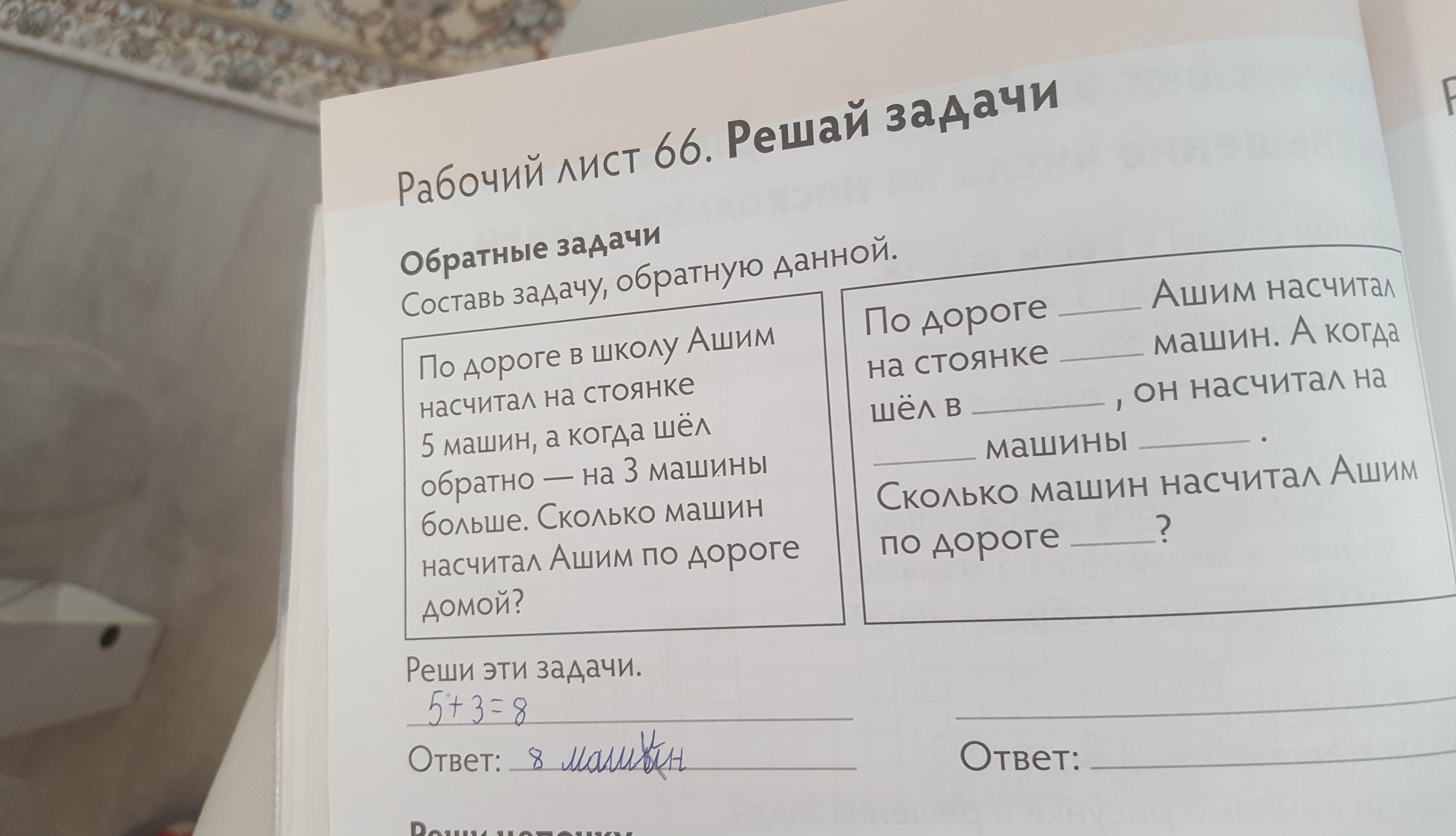 По дороге в школу Ашим насчитал на стоянке 3 машин. А когда шёл обратно , он насчитал на 5 машин больше. Сколько машин насчитал Ашим по дороге машин?