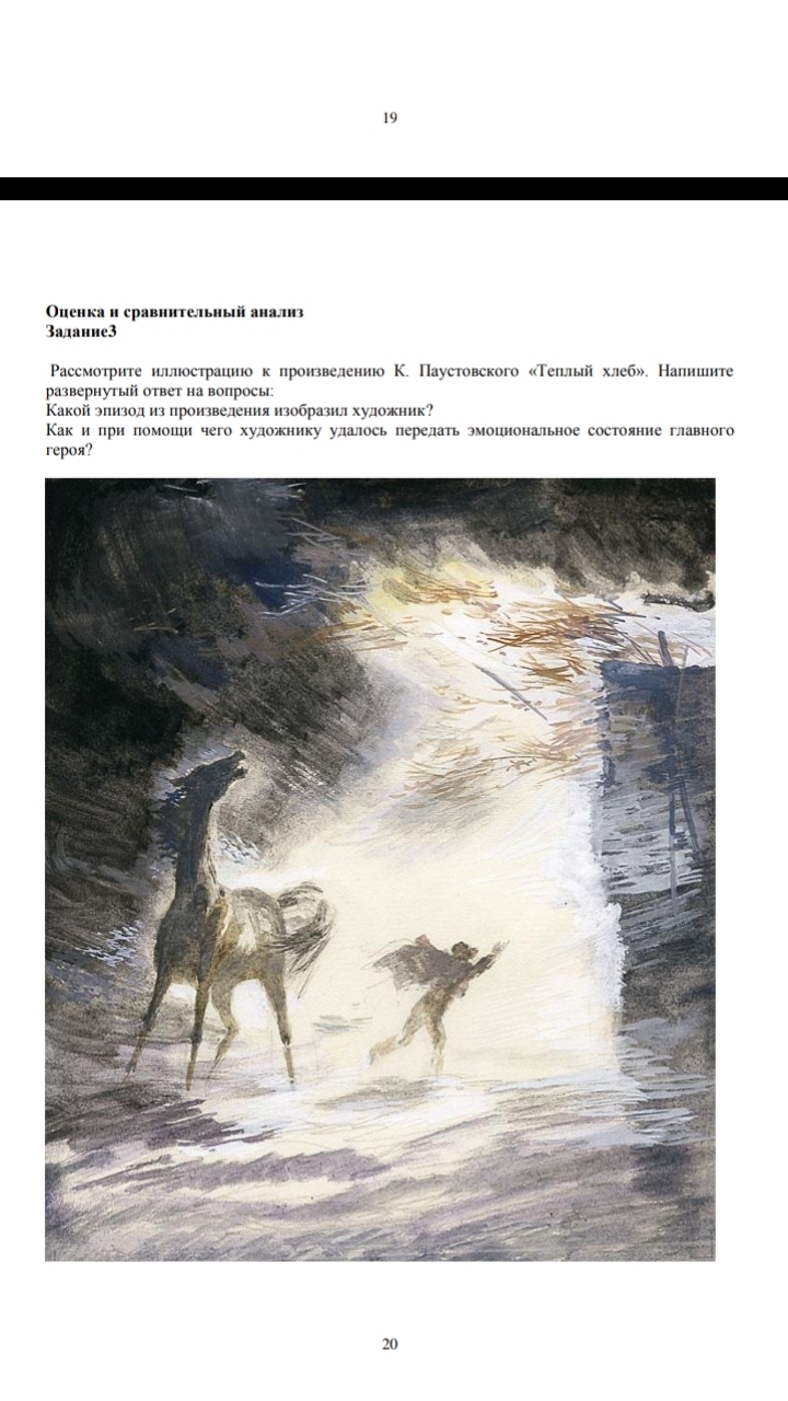 Эта картинка относится к эпизоду, где Филька бросает хлеб коню и конь начинает злиться и разгонять бурю. на этой иллюстрации автор передал эмоциональное состояние героя с помощью цветов,0 он изобразил холодные и тёмные тона, что означают злость, ненависть и обиду.