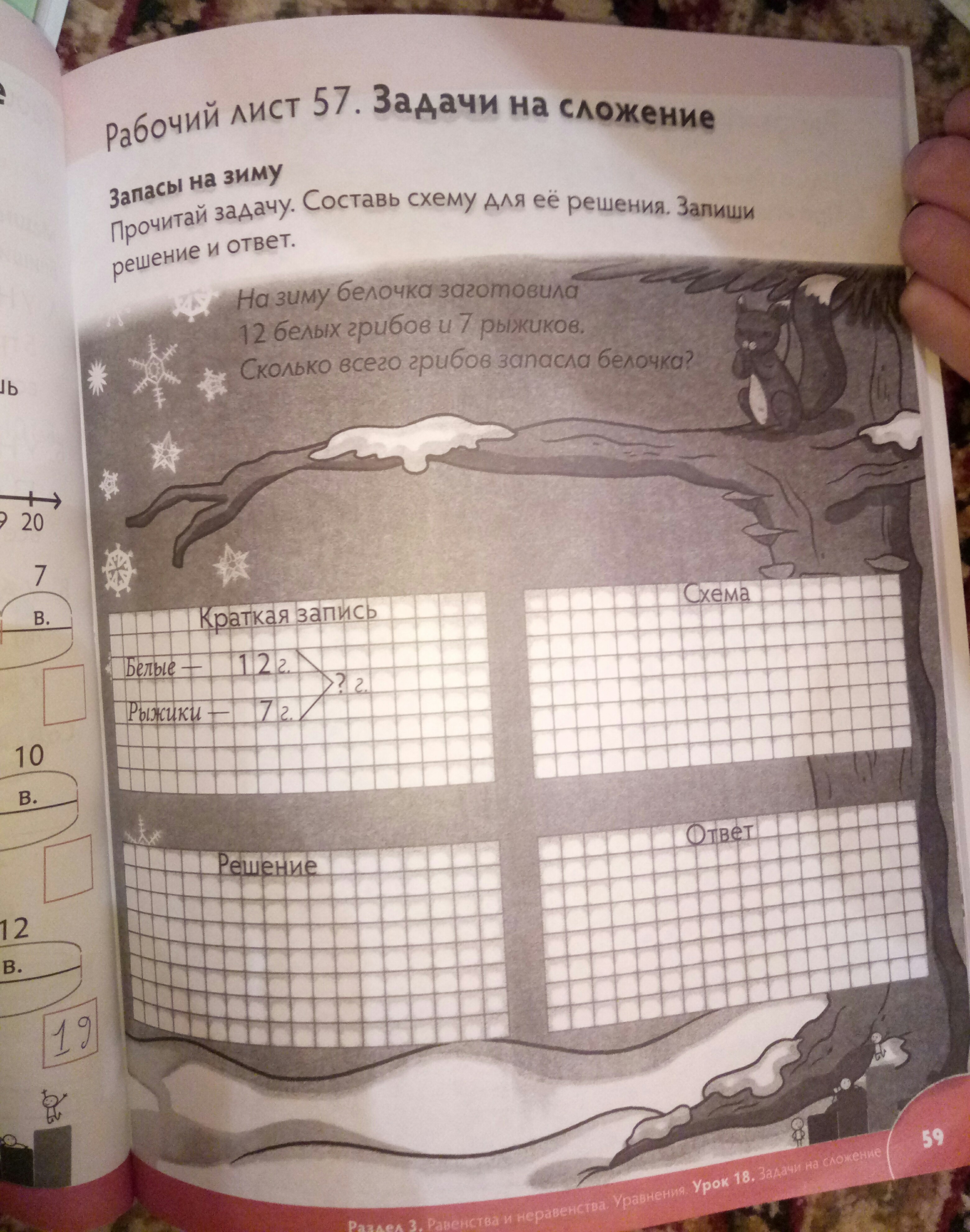 на зиму белочка заготовила 12 белых грибов и 7 рыжиков сколько всего грибов запасла белочка