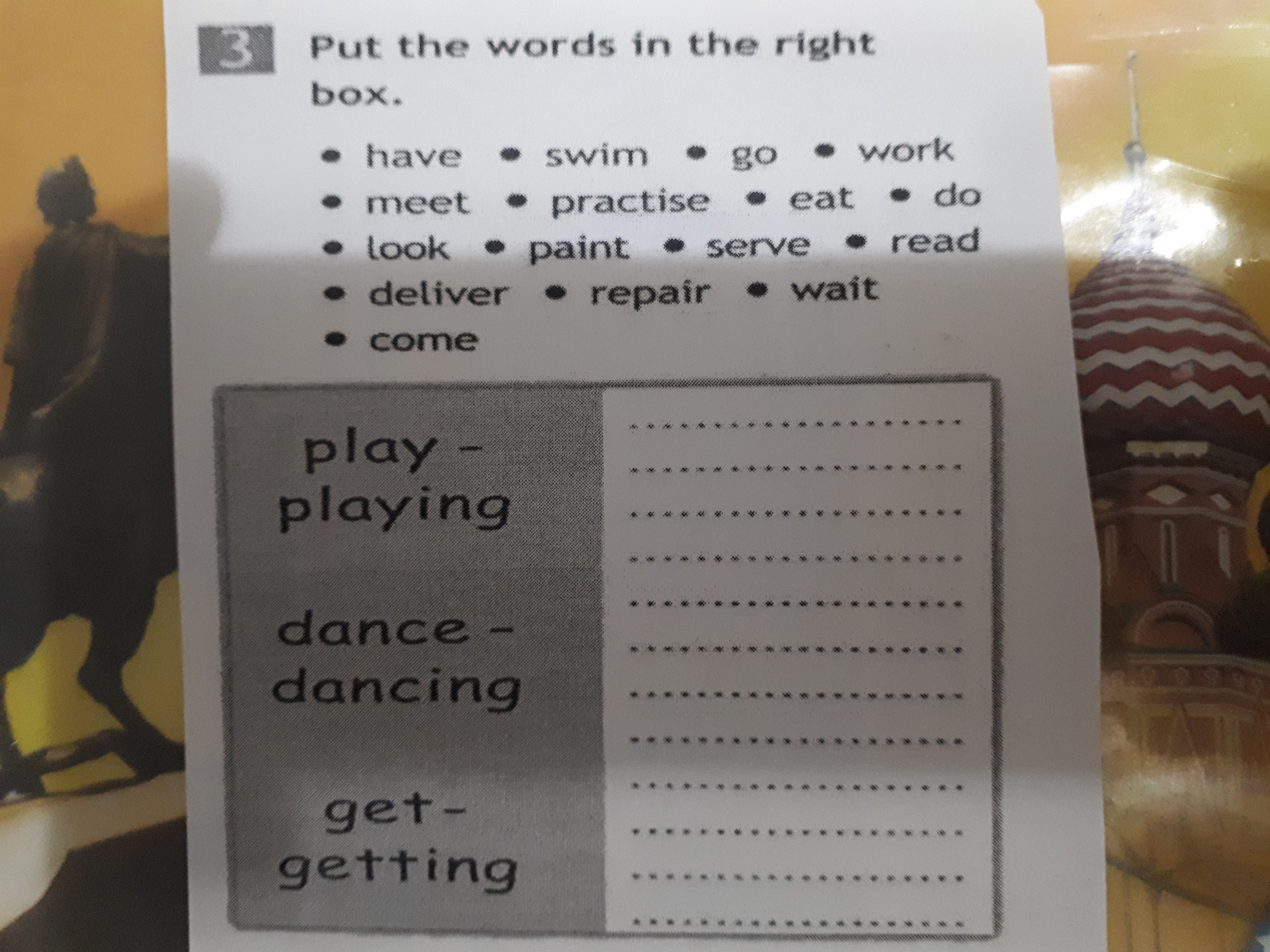1. go - going, work - working, meet - meeting, eat - eating, do - doing, look - looking, paint - painting, read - reading, deliver - delivering, repair - repairing, wait - waiting