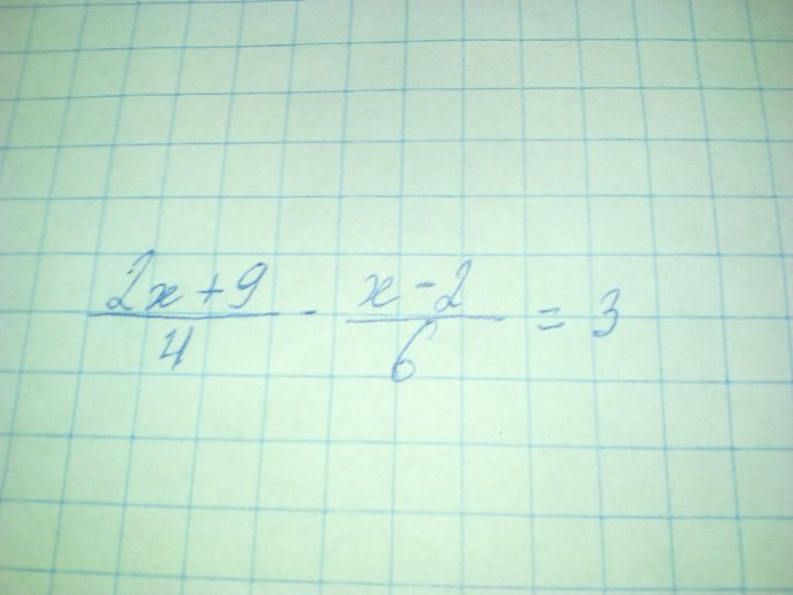 (2х + 9)/ 4 - (х-2)/6 = 3 (избавимся от знаменателей, домножив на 12 соответственно)
