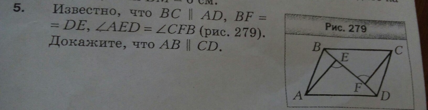 1 Нужно доказать, что треугольник BCF=AED. По двум углам и стороне между ними. BF=ED, угол AED=BCF, углы CBD=BDA(накрест лежащие при BC//AD) Треугольники равны2 Поскольку углы цбд и бда равны, абд=бдц = >являются накрест лежащими=> прямые параллельны