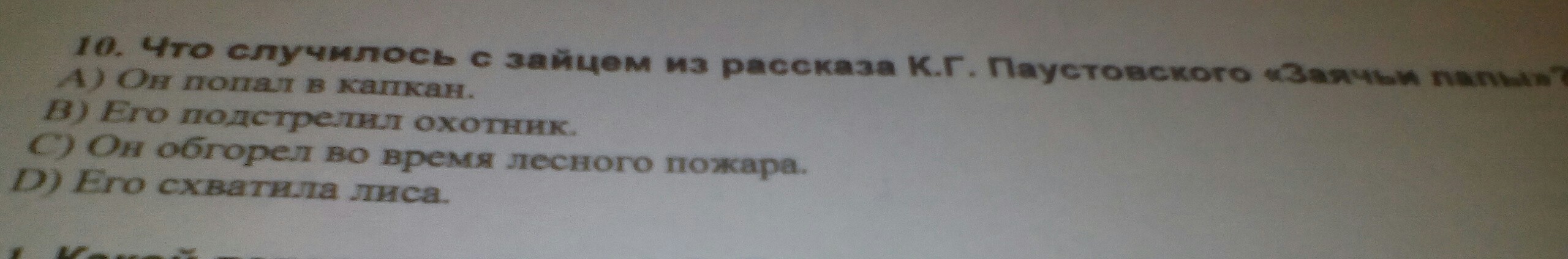 C), в рассказе Паустовского "Зайчьи лапы", заяц обгорел во время пожара.