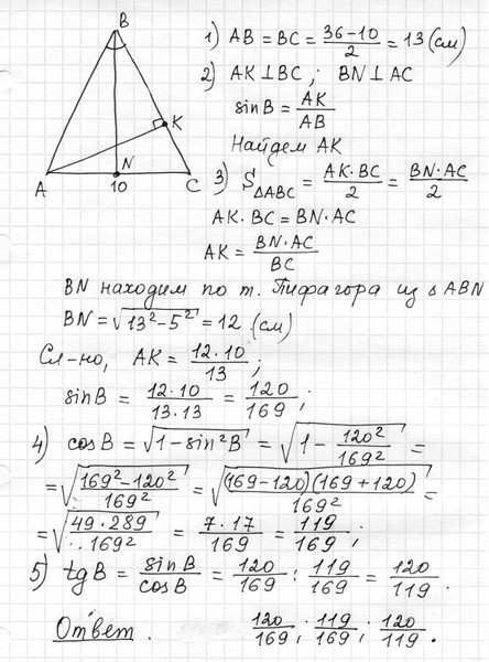 Далее решить уравнение 13^2-x^2=10^2-(13-x)^2, т. е. найти длину отрезка BK, потом найти косинус угла В, затем синус, а потом и тангенс.